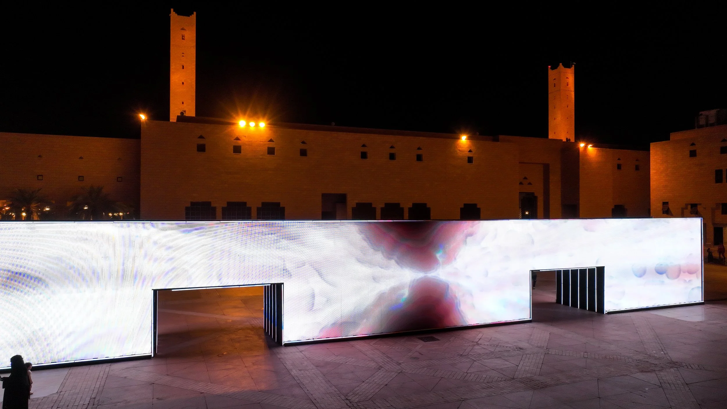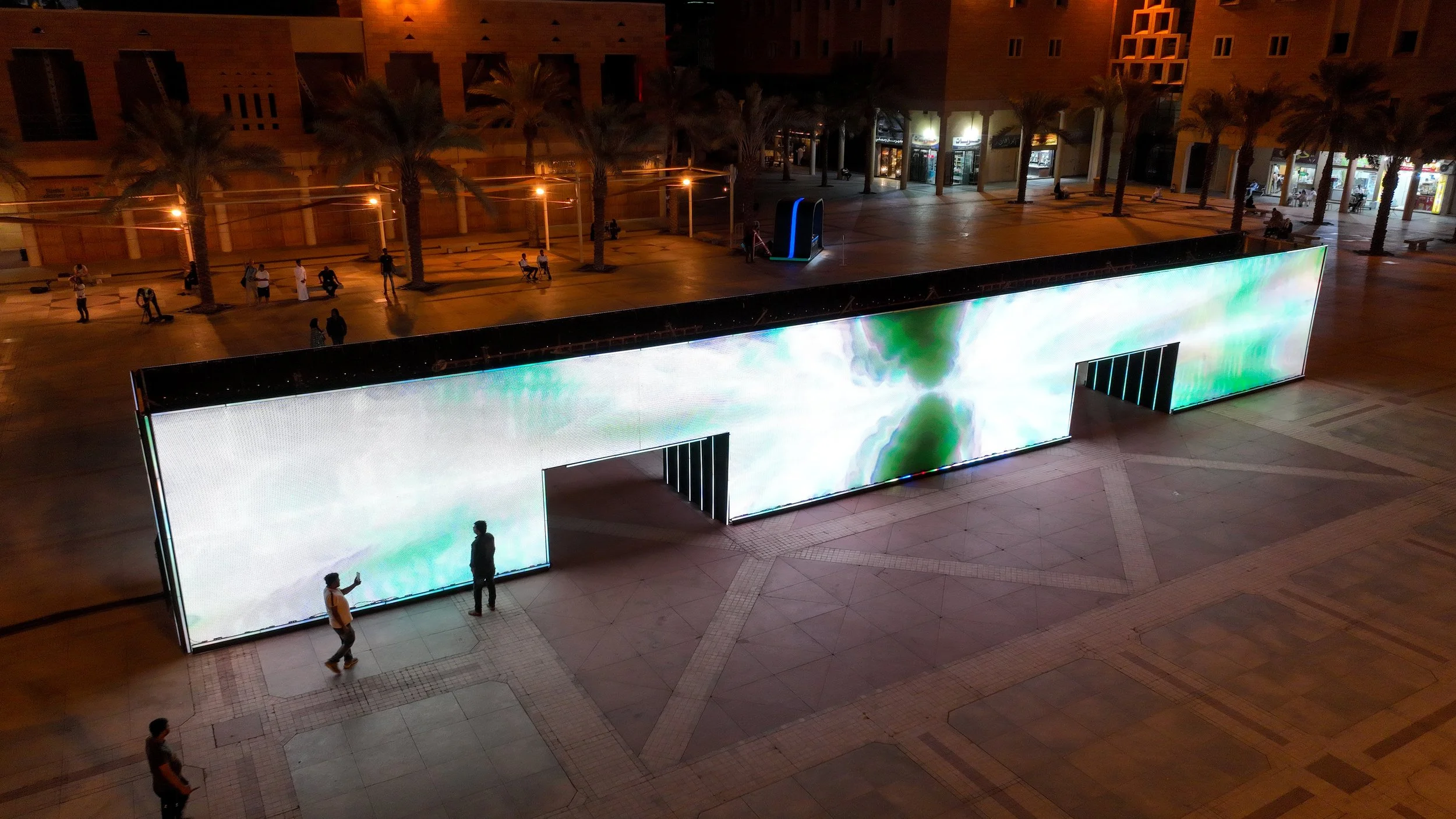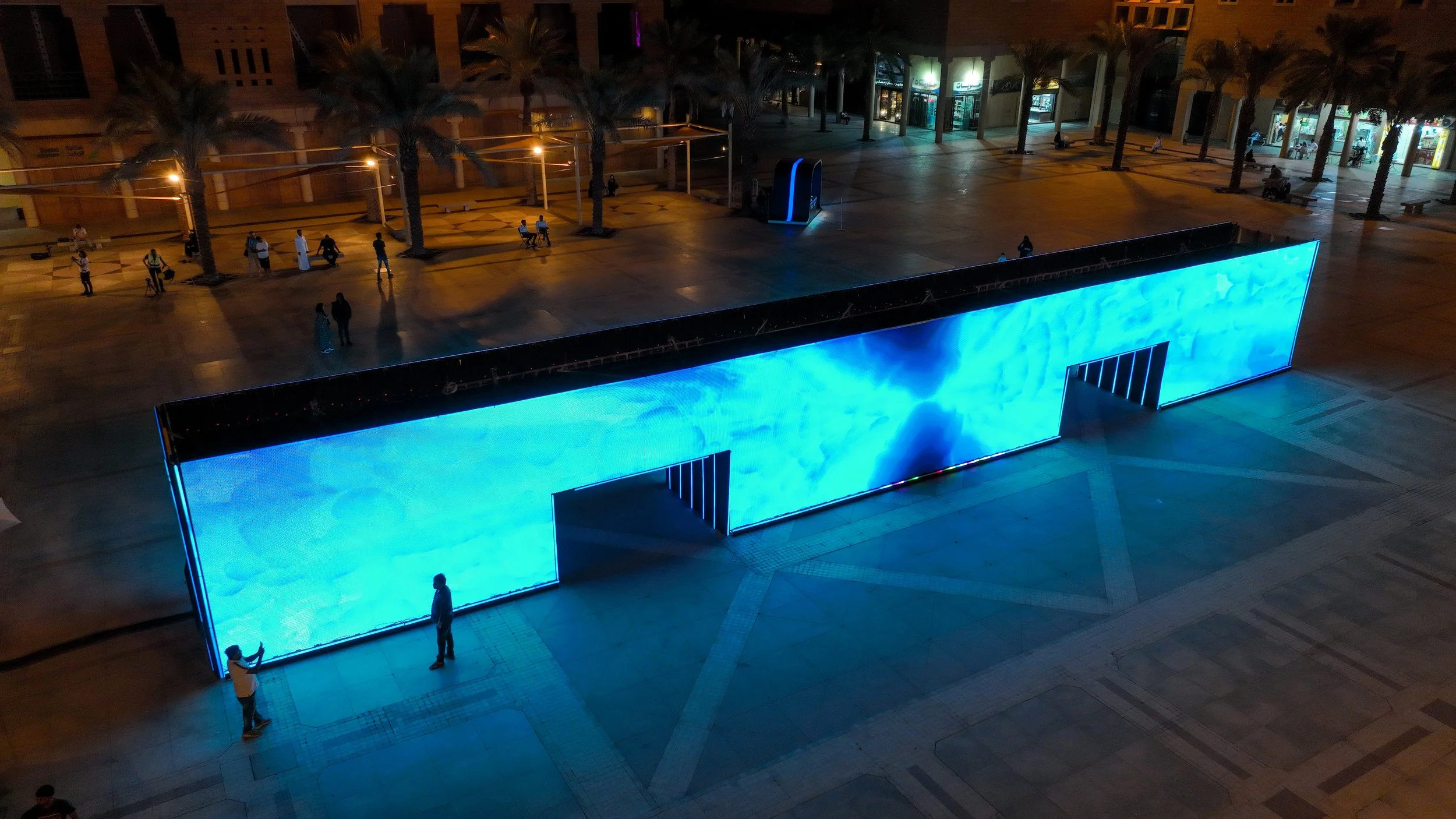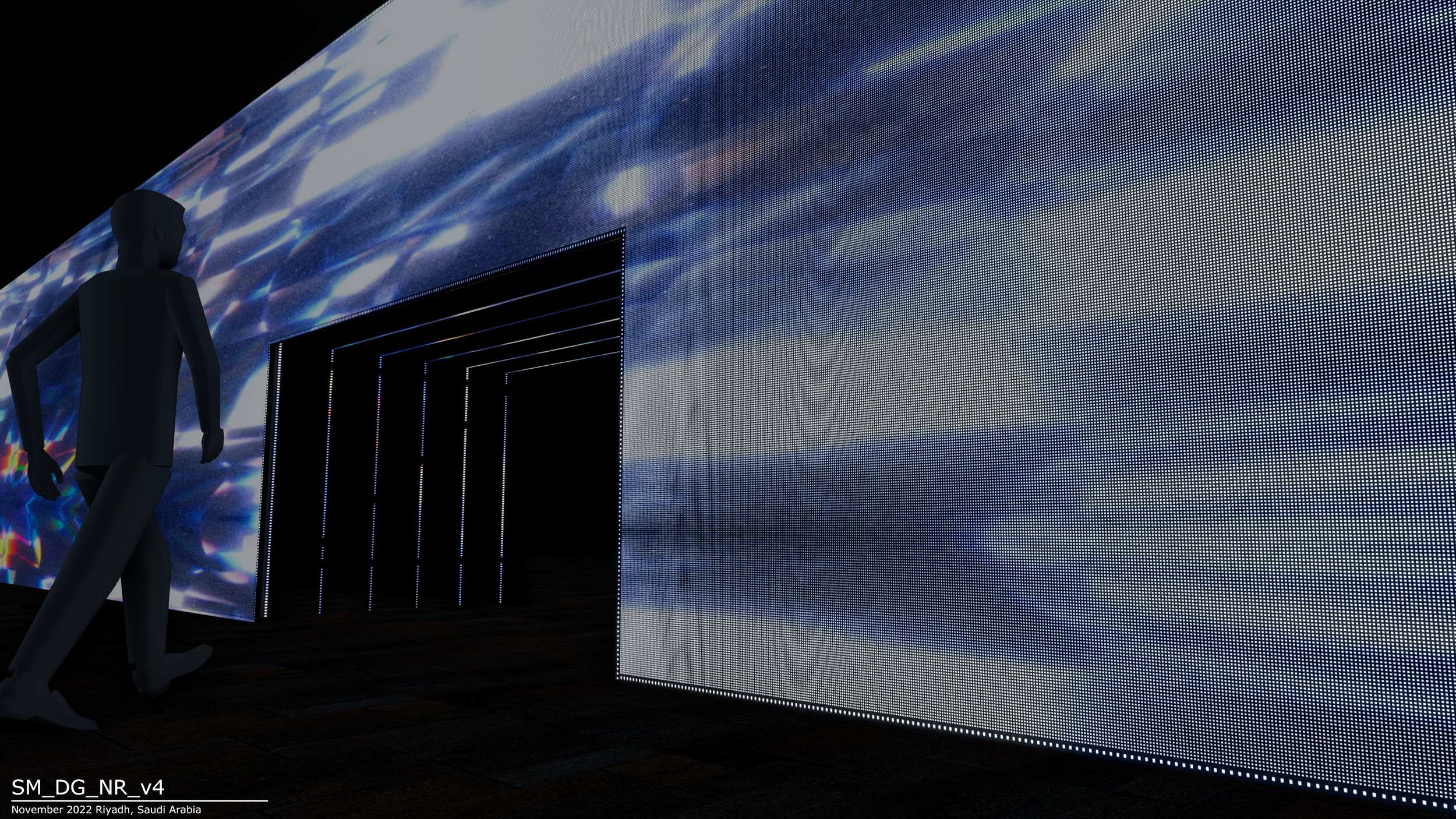 The physical structure of the installaion is a composition of a 30-metre long, 4-metre high double-sided LED screen wall, and dual archways are cut through this wall to allow passage through the screen for viewers. The screening resolution is 3600px wide by 480px high on 416 LED Panels and 242 Pixel Strips.