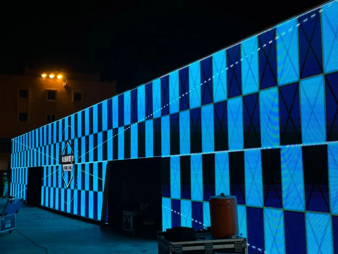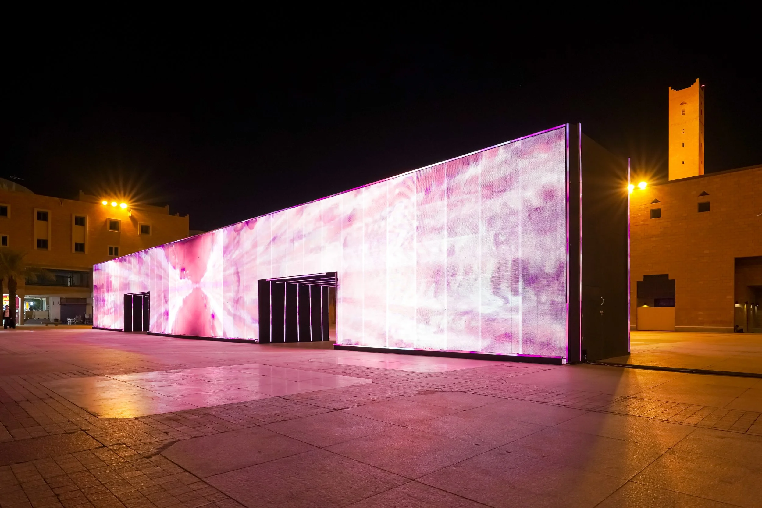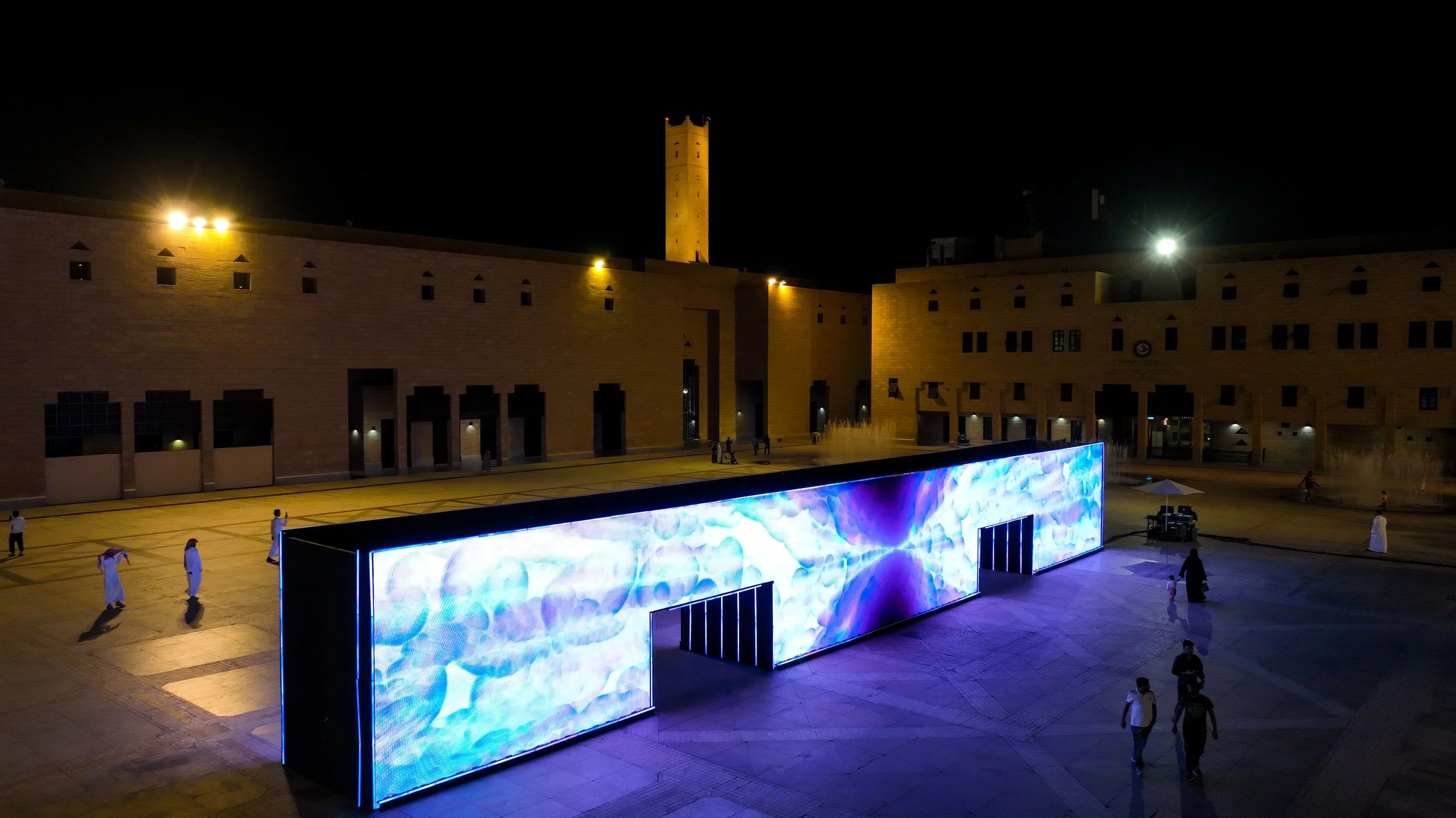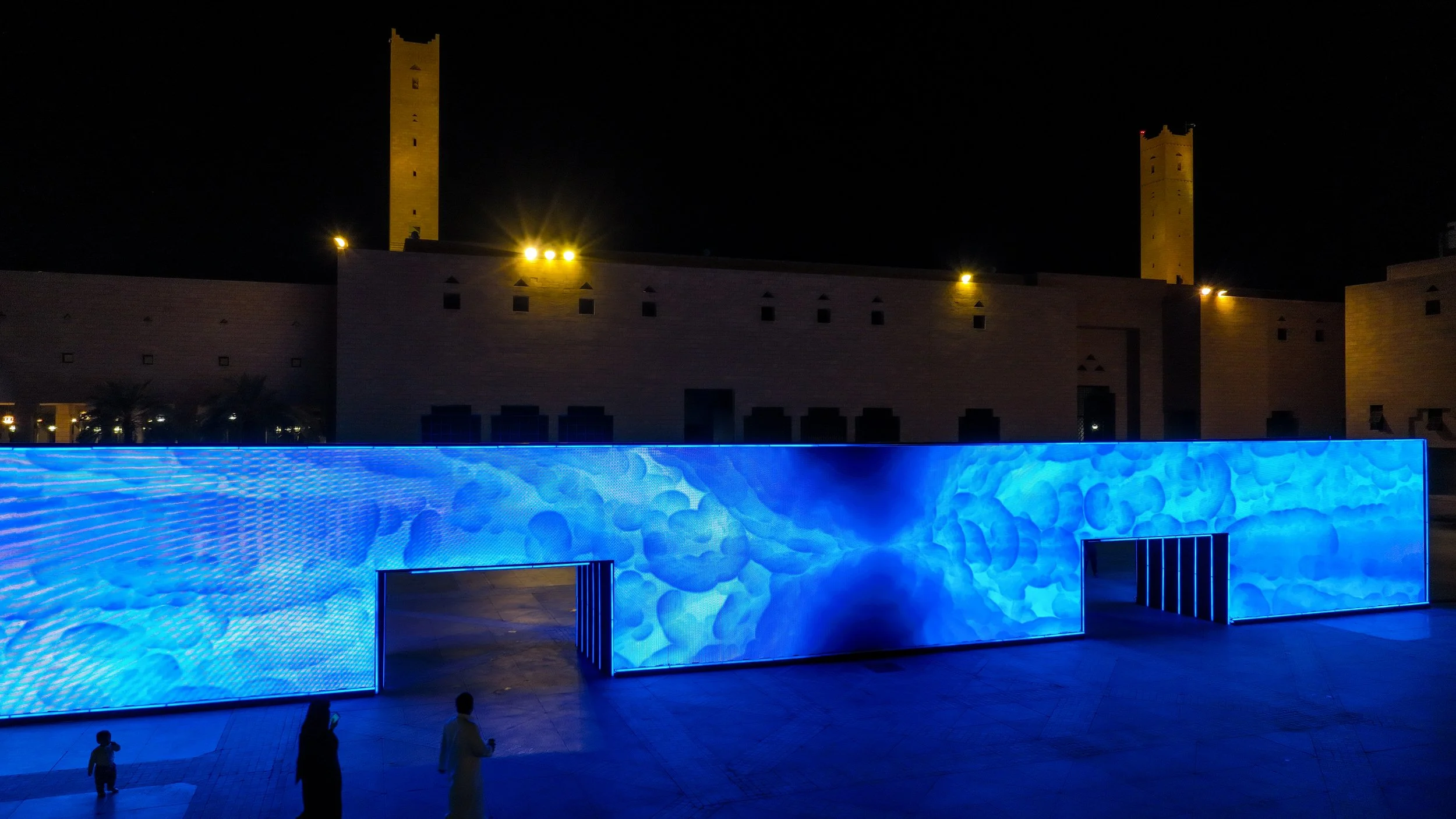 The physical structure of the installaion is a composition of a 30-metre long, 4-metre high double-sided LED screen wall, and dual archways are cut through this wall to allow passage through the screen for viewers. The screening resolution is 3600px wide by 480px high on 416 LED Panels and 242 Pixel Strips.